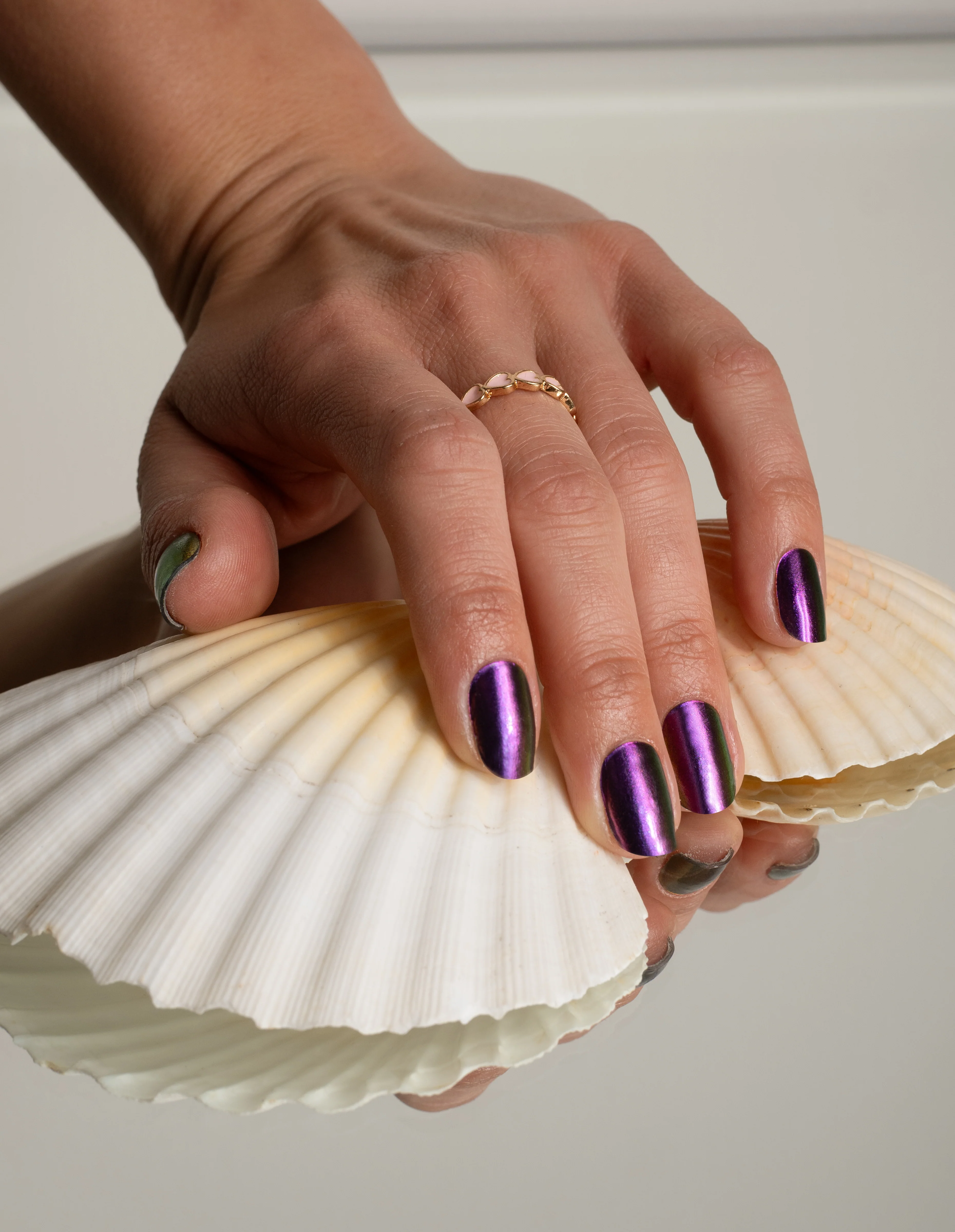 With Purple Crush UV, every look becomes a highlight. The unique chrome gradient combines intense violet tones with shimmering metallic effects, giving the nails a special depth. Depending on the light, the colors shift between a bold purple and cool silver reflections β perfect for a stylish summer appearance. This design captures the magic of summer and makes a true statement with its extraordinary shine.
